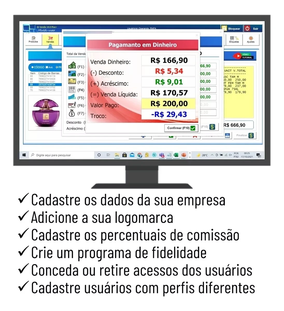 Funcionalidades Exclusivas: Cadastre usuários com diferentes perfis de acesso, adicione a logomarca da sua empresa, crie um programa de fidelidade e personalize os percentuais de comissão.