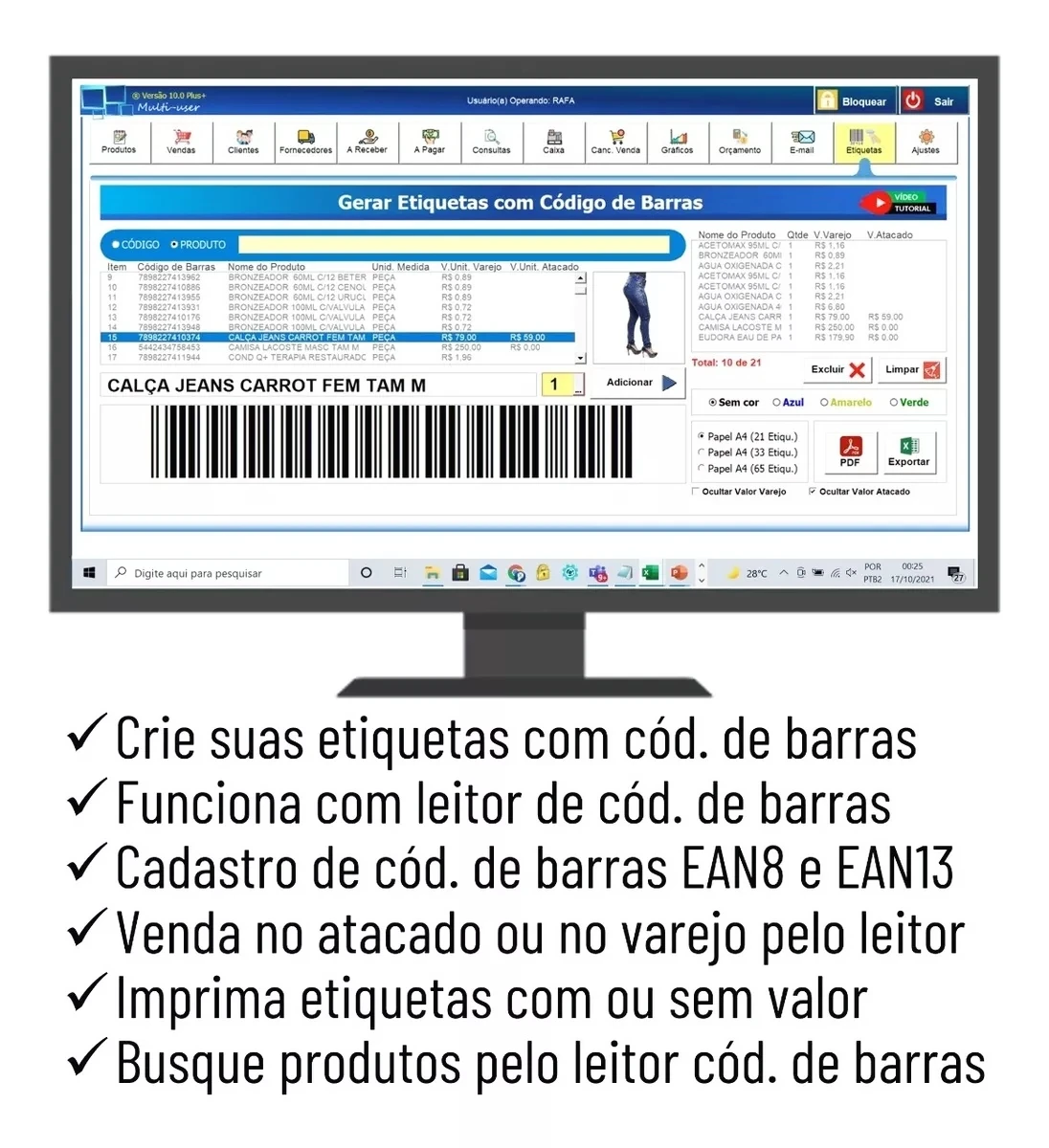 Controle de Estoque e Produtos: Crie suas próprias etiquetas com código de barras, utilize um leitor para agilizar a busca de produtos e gerencie seus itens com cadastro de código EAN8 e EAN13.