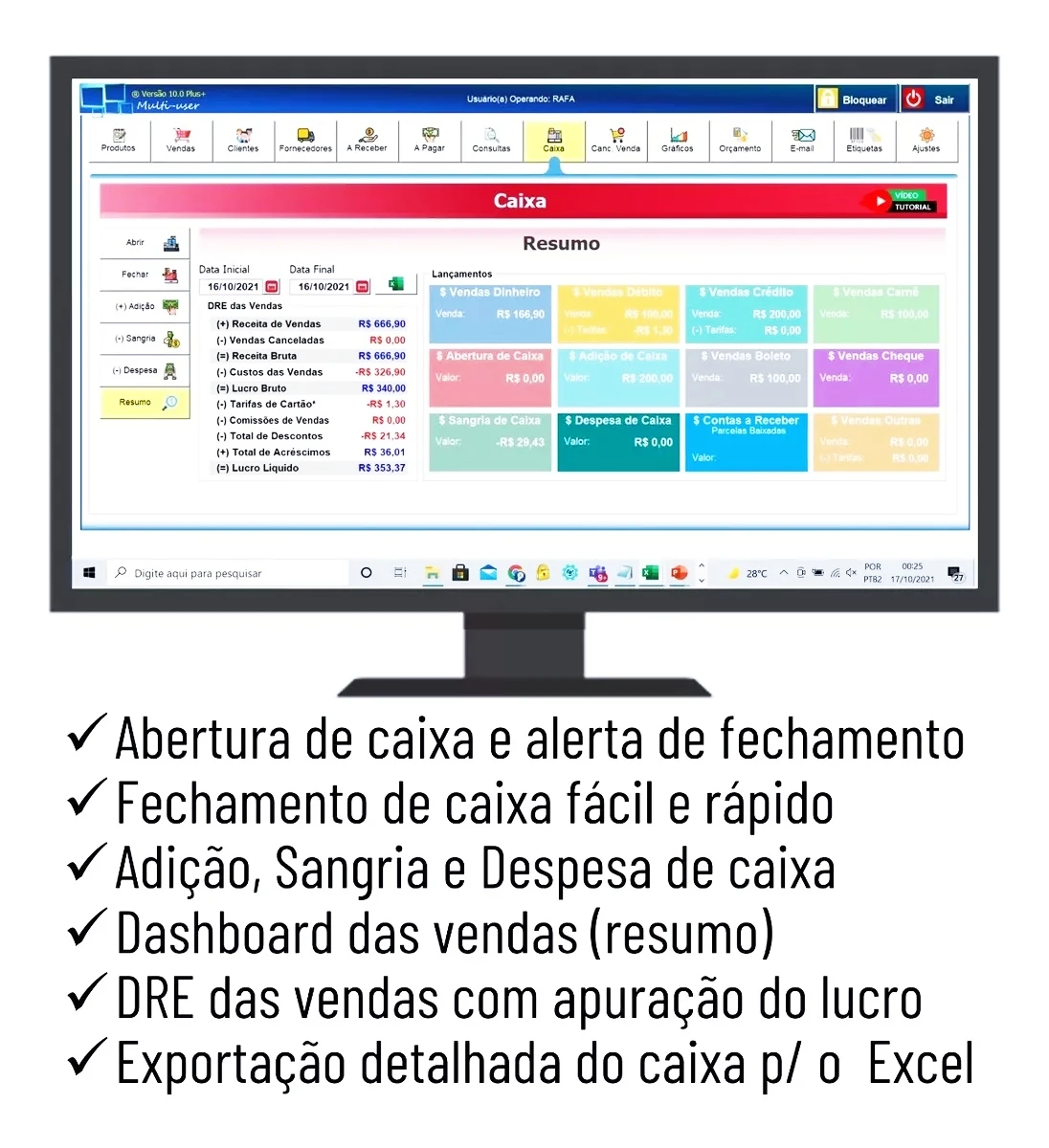 Gerenciamento de Caixa: Tenha controle total do seu financeiro com abertura e fechamento de caixa, registro de sangrias e despesas, e uma dashboard completa de vendas. Exporte todos os dados detalhados do caixa para o Excel.